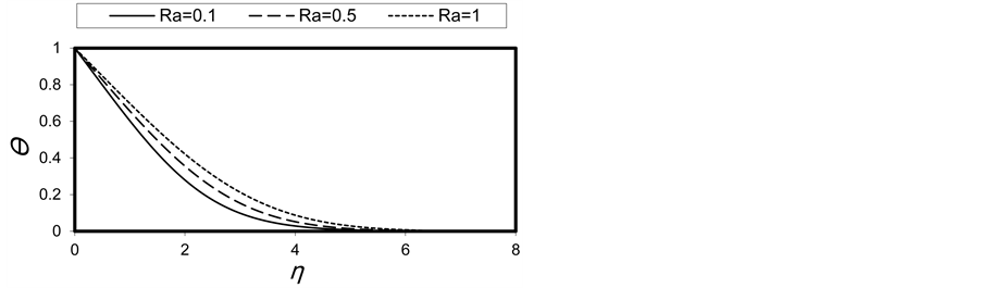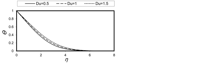 . Figures 11-15 represent the temperature profiles for the flow parameters. It is observed that the temperature increases with increasing Ra, E and Du, while decreases with increasing