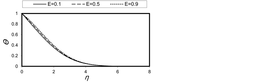 The temperature distribution increases with the increase of Ra, E and Du, while it decreases with the increases of Pr and