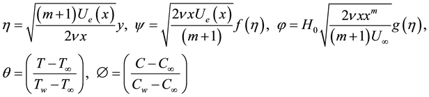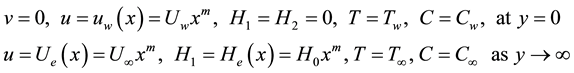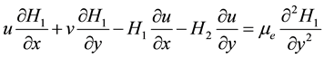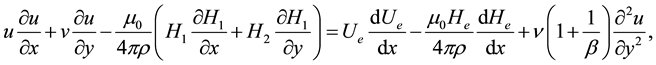 are the velocity and magnetic components in (x, y) directions, respectively, subject to the boundary layer approximations, Equations (5) and (6) for the problem under consideration can be reduced to: