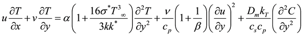 , radiation parameter Ra, Prandtl number Pr, Eckert number E, Dufour parameter Du, Schmidt number Sc, and Soret number S0. These effects are illustrated graphically through a set of (1 - 18).