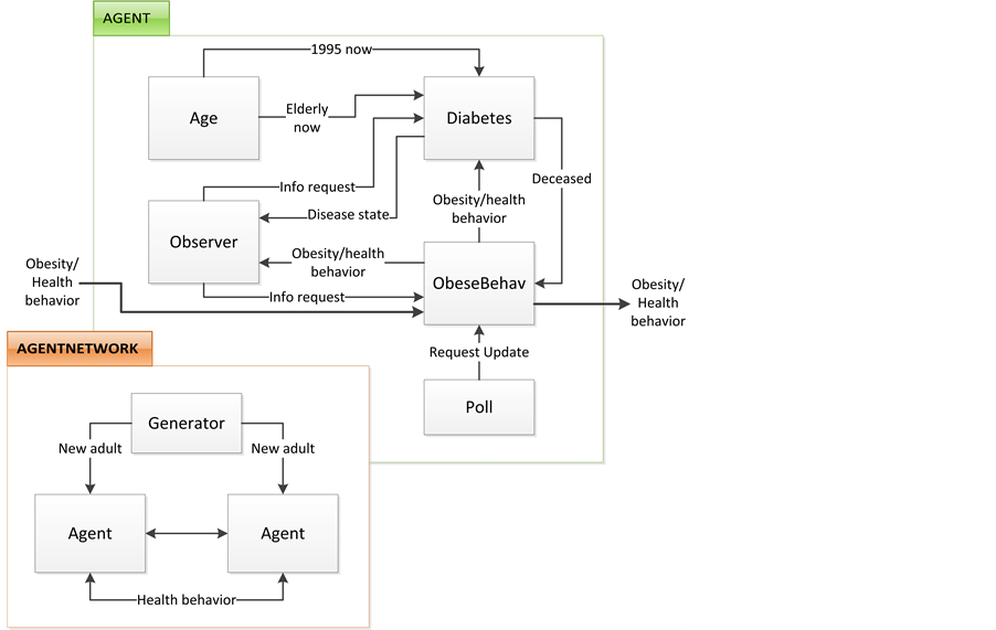 The agent model comprises five classes to separate clusters of agent characteristics and behaviors. The model diagram in Figure 4 shows inputs, outputs and wiring of the basic objects in the base model. Diabetes state management (movement between stocks) occurs in the Diabetes object, and the current obesity health behavior state (Figure 3) is managed from ObeseBehav. Other classes were developed to maintain specific functions: 1) the Observer collects critical time series output data and writes these data to a file; 2) Age notifies agents when they become elderly and when they are eligible to diagnose for pre-diabetes in 1995; and 3) the Poll object requests at exponentially-determined intervals (mean = 0.25 year) a new assessment of social norms prevalent in its social network from the agent. The assessment is performed by the ObeseBehav object. No communication occurs between Diabetes and ObeseBehav objects in the uncoupled (baseline) model, but behavioral models require the ObeseBehav object to transmit its state to the Diabetes object because state transition times depend on obesity state. Both these objects communicate their states to the Observer at annual intervals. The dark lines breaking the Agent borders (defined by the green dashed lines in Figure 4) communicate state information between agents in the same network in order to obtain updates on changing social norms about healthy behaviors. The agent network superstructure is denoted in the orange box, where agents share information with each other.
