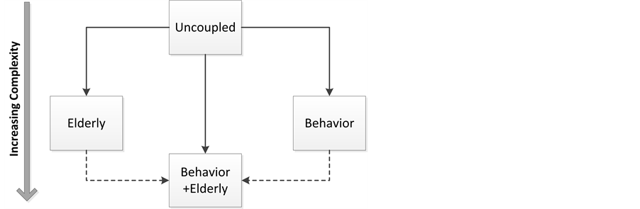 The SDDM2 model is a large model that closely replicates historical DM2 outcomes data. However, the sheer magnitude of the number of inputs makes it difficult to determine which inputs are really necessary to produce a good fit to DM2 outcomes. It could be argued that large sections of the model are not really required to obtain a reasonably good fit. In developing an agent-based model system for DM2, we intended to systematically test the importance of various parameter types. With this goal in mind, a model hierarchy was created with the baseline (uncoupled) model at the root (Figure 5). The modeling system implemented the 31 adjustable parameters listed in the Appendix. The uncoupled model had seventeen adjustable parameters to replicate the stock and flow dynamics in Figure 2, but it was not connected to calculations for obesity and healthy behaviors. The three child models inherited the seventeen flow parameters from the uncoupled model. The elderly model required four adjustable parameters to modify flow dynamics factors for onset, recovery, progression and death due to aging. The behavior model also required estimates for four diabetes factors, and six parameters associated with the obesity-health behavior state transition model including four transition time parameters and two conditional probabilities. It would be possible to create a behavior + elderly model simply combining estimated parameters from the other three models, using polymorphic inheritance to fill in the values of the adjustable parameters. However,