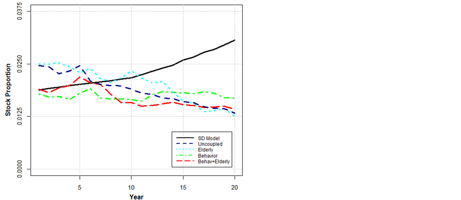 Uncomplicated diabetes stock proportion predictions are presented in Figure 9 and Figure 10. Coupling of elderly and health behavior parameters in the behavior + elderly model somewhat elevated the undiagnosed uncomplicated diabetes stock proportion. The proportion of diagnosed uncomplicated diabetes cases steadily declined for all ABSDM2 models, whereas the SDDM2 proportion slowly increased over the 20-year period.