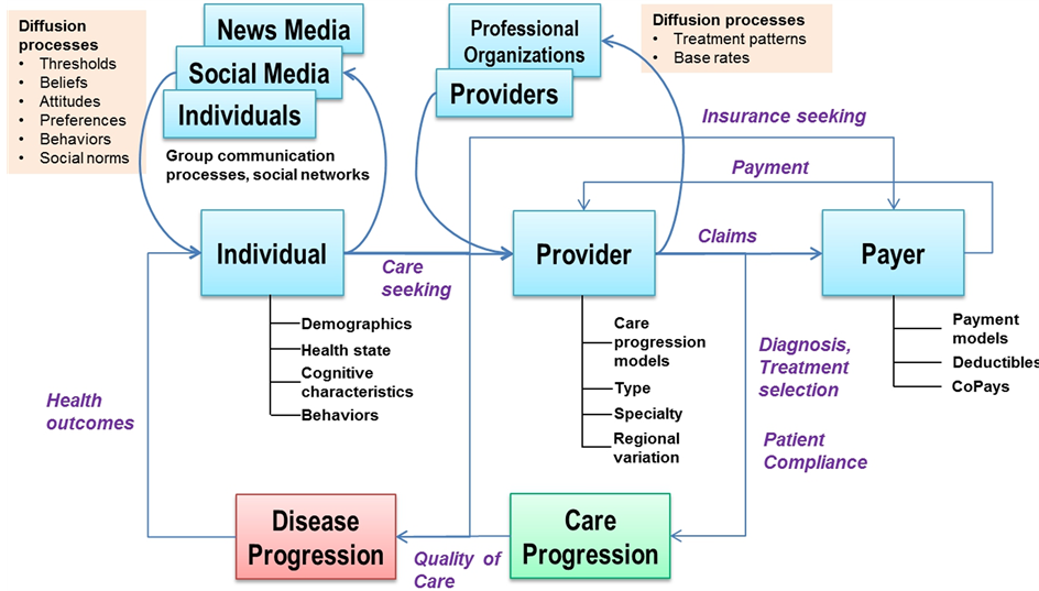 A fundamental dynamic in healthcare delivery systems is the behavioral interaction between patient and physician (provider). This basic interaction can itself be further analyzed for various dynamic behaviors, predispositions, intervention choices, etc. A generalization beyond the patient-provider interaction has diverse additional components as described in Figure 1. The figure, itself a more detailed elaboration of the workflow defined in [2] , shows behaviors, influences, and other elements of a healthcare “knowledge core” which can be called out as modules and parameters in an individual simulation model. Each interaction between agents has its own characteristics, and modeled actions to be taken. Because many aspects of the healthcare system are not known in detail, the ABS must be constructed modularly in order to allow testing many different component models. This is done quite naturally by defining a family of embedded models that proceeds from the conceptually simple to more complex models.