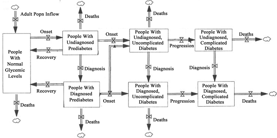 Figure 2. Stock and flow diagram for diabetes mellitus type 2 model (modified from [7] ).