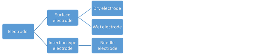 As shown in Figure 1, electrodes can be divided into insertion electrodes and surface electrodes and surface electrodes can be divided into dry electrodes and wet electrodes. At the state of rest, there are a certain number of positive ions inside of cardiac muscle cell and the same amount of negative ions outside. When the cardiac muscle cells get a certain extent of stimulus, the permeability of cardiac muscle cell would change and the positive ions would rush into or exhaust from the cell membrane and form an electric potential difference. The electric potential difference is the foundation of electrode collecting biological signals. Needle electrode is a typical insertion electrode, which collects every moving part signal by inserting it into the human skin. Although the signal acquisition method can accurately collect biological signals, it needs not only high operation requirements, but also can cause severe harm to human body.