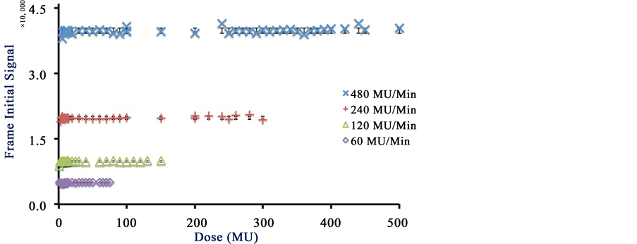 The observed EPID response is delayed until after the beginning of irradiation by at least one integration time. The first completed frame after starting the radiation (FN0) contains the first measurable frame signal (FS0), the value of this signal is variable and depends on the coincidence of frame readout with the start of irradiation. The shorter the time between the beginning of frame formation and the start of the radiation beam the higher the FS0 value. FN0 is fixed at a value of six in this study for presentation purpose only. After several frames, or integration times, the frame signal increases to a much higher value, the initial maximum frame signal (SFI), at the frame number FNI. The value of SFI is found to be independent of the delivered radiation dose and constant for a given dose rate and integration time combination, Figure 4. The value of SFI is also dependant on the electronic gain setting of the EPID. EPID-1 was set for a low gain setting resulting in an SFI value of around 14% of the dynamic range and EPID-2 was set for a higher gain with an SFI value of around 60% of the dynamic range, both at the highest dose rate and fastest integration time. The signal profile of EPID-1 is similar for all the dose range and exhibits a steady and slow increase during irradiation shown in Figure 3. EPID-2 on the other hand has shown two different patterns during irradiation, one for dose range lower than 150 MU in which the signal profile is almost constant during irradiation, and the other is a signal profile with slightly decreasing values during irradiation for the rest of the dose range.