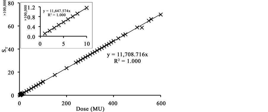 Figure 7. The total integrated signal is linear for the whole range, the small dose range is highlighted in the subset frame. Solid line is the linear fit curve.