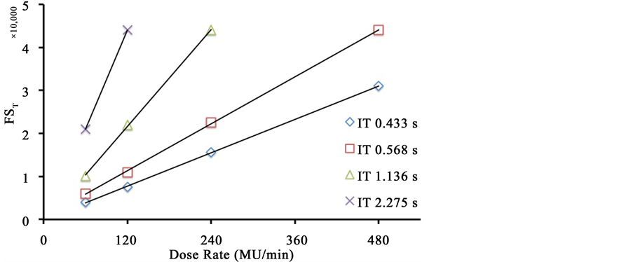Figure 8. FSI as a function of dose rate for the different available integration times. Its value is independent of the radiation dose and depends only on dose rate and integration time. The solid lines represent linear fit curves.