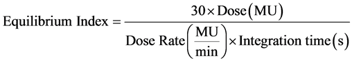 For a given radiation dose defined by MU setting and dose rate to achieve frame readout equilibrium with a certain integration time, at least one frame readout has to be started after the commencement of irradiation. In addition, the radiation beam has to last at least to the end of the subsequent frame’s integration time, because the first frame will always suffer the readout start-up effect and the fact that half the signals in any subsequent frame are generated in the preceding one. In other words, in order to achieve readout equilibrium the irradiation time has to be long enough to accommodate the formation of at least two fames, or more than twice the integration time. The duration of radiation pulses or beam time in seconds can be calculated from the dose and dose rate using Equation (2). The ratio of beam time in Equation (2) to the integration time represents the number of frames that can be formed with that radiation dose, dose rate and integration time combination. This ratio is useful to indicate whether that radiation dose, dose rate and integration time combination will result in readout equilibrium or not. When normalized to the minimum number of frames required for equilibrium it could be used as an equilibrium index that designates frame readout equilibrium with values more than unity, Equation (3).