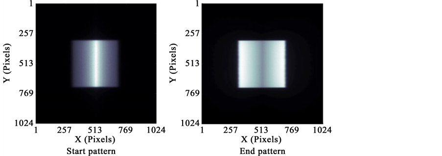 During image acquisition with the iViewGT EPID, peculiar patterns may be observed at the beginning of radiation beam delivery and at the end of irradiation. As the radiation beam starts, the first few frames show a gradient in the radiation beam intensity across the field with the highest intensity at the center of the detector and the lowest towards the two ends of the detector along the Y-axis as shown in Figure 2. This figure demonstrates a greyscale image analogous to that observed in the XIS software on the iViewGT terminal during actual measurements. After the first few frames, iViewGT images exhibit a uniform radiation field. At the end of irradiation, a similar but converse pattern is observed with the highest intensities now at the two ends and the lowest intensity at the center of the EPID as shown in Figure 2. These patterns are observed in all measurements, regardless of the EPID employed, dose, dose rate, integration time, field size and whether an imaging object is present or not. Furthermore, the gradient always starts at the center of the EPID even with off centered and asymmetric fields. To investigate, and visualize, the effect of the iViewGT image formation process on the measurements, a computer model for the EPID was designed using MatLab.