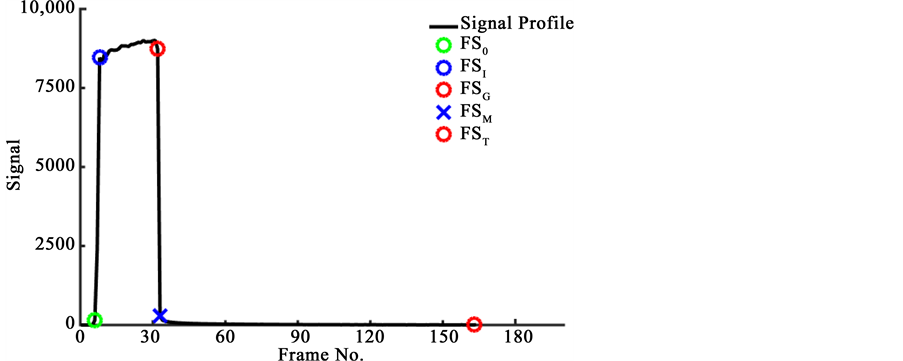 Figure 3. Signal profile from EPID-1 after bad pixel, offset and gain corrections for 100 MU at a dose rate of 540 MU/min and using 0.433 second integration time. The frame first signal after irradiation FS0, the frame initial maximum signal FSI, frame global maximum FSG, frame maximum FSM and terminal maximum FST signals are highlighted.