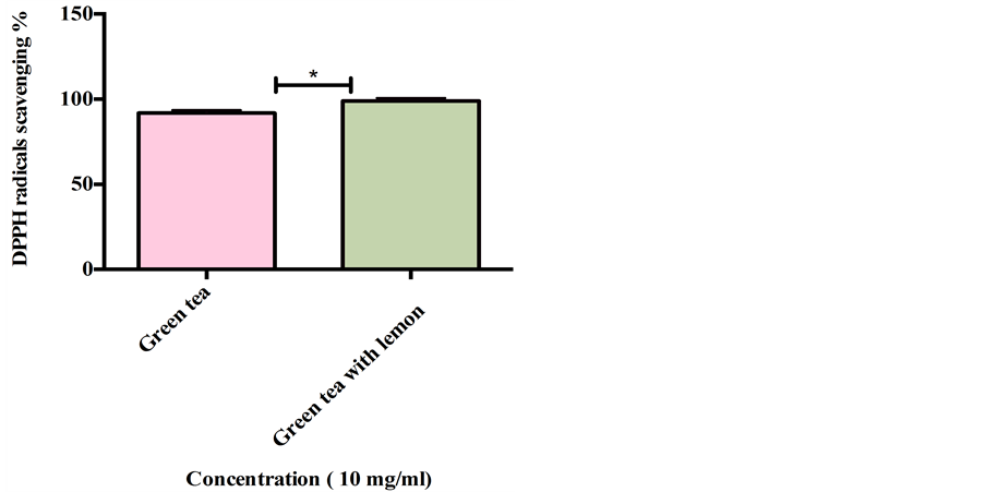 Figure 1. Radical scavenging activity of green tea without and with lemon. The value expressed as mean ± SD (n = 3) of triplicate measurements. Comparisons of means were ma- de using unpaired t-test (*p < 0.05).