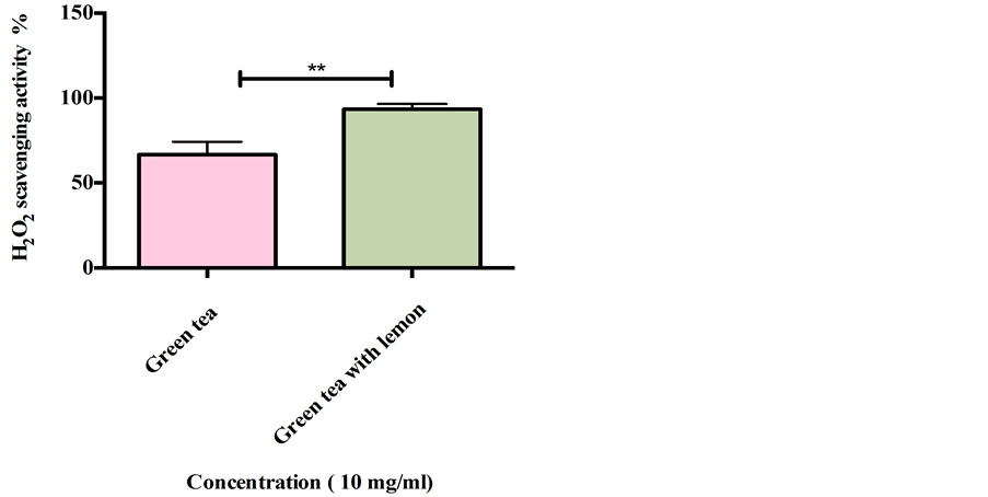 Figure 2. H2O2 scavenging activity of green tea without and with lemon. The value expressed as mean ± SD (n = 3) of triplicate measurements. Comparisons of means were made using unpaired t-test (**p < 0.005).