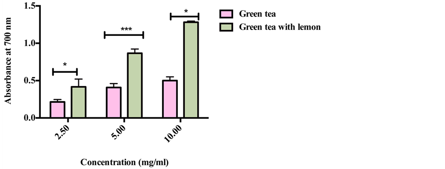 Figure 3. Reducing power of different concentrations of green tea without and with lemon. The value expressed as mean ± SD (n = 3) of triplicate measurements. Comparisons of means were made using unpaired t-test (*p < 0.05 and ***p < 0.005).