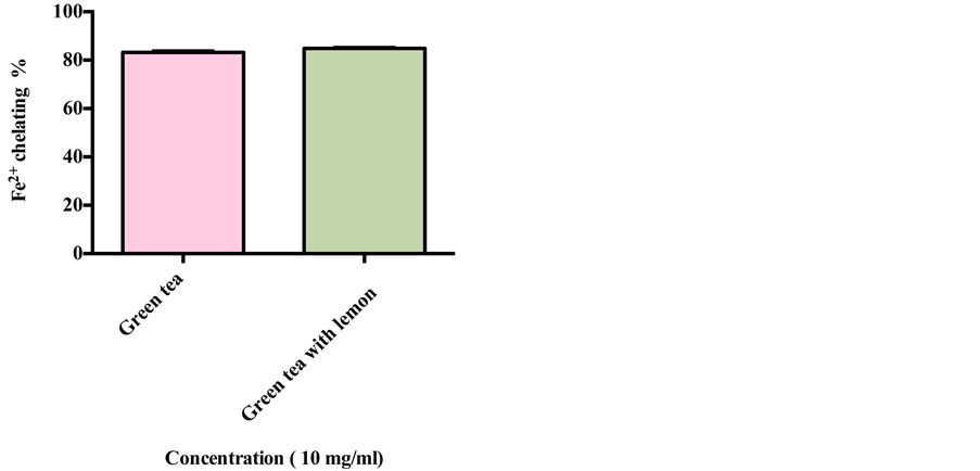 One of the mechanisms of antioxidant action is the chelation of transition metals that prohibiting stimulation of hydrogen peroxide dissociation [18] . This method is based on the inhibition of ferrous-ferrozin complex formation by the antioxidant compound present in the green tea and lemon. By comparing the two results, it can be seen that there is no significant difference in iron chelating activity at the same concentration (10 mg∙ml−1) in both samples (Figure 4).
