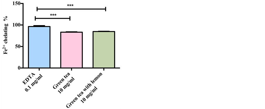 Figure 5. Ferrous chelating activity of green tea without and with lemon compared with EDTA at 0.1 mg∙ml−1. The value expressed as mean ± SD (n = 3) of triplicate measurements. Comparisons of means were made using a one-way ANOVA followed by Bonferroni’s test (***p < 0.0005).