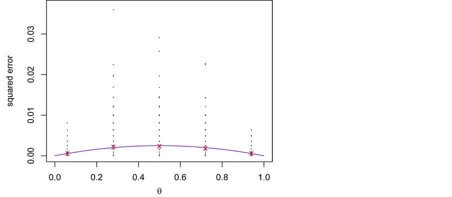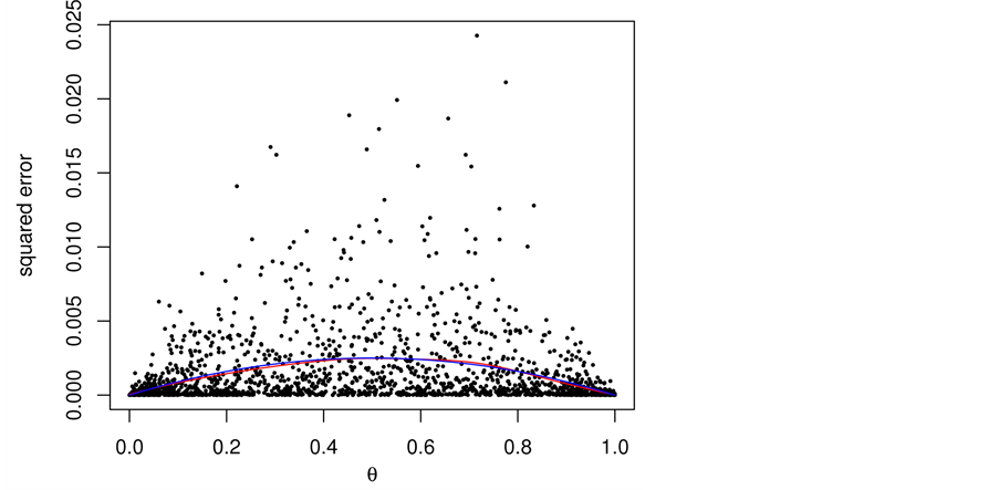 , the 500 points are squared errors for sample proportions from simulated binomial experiments with