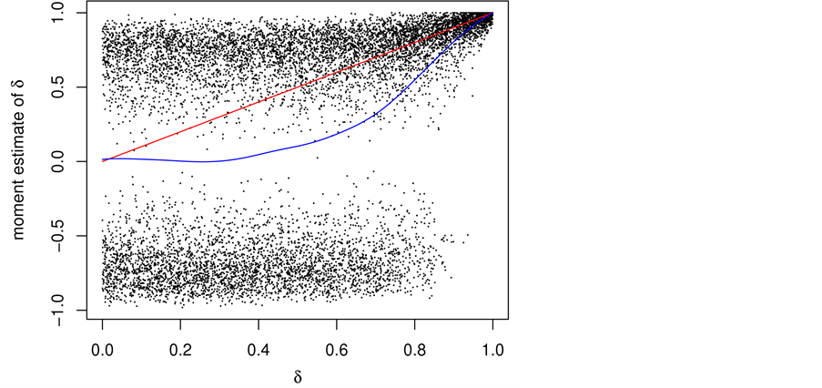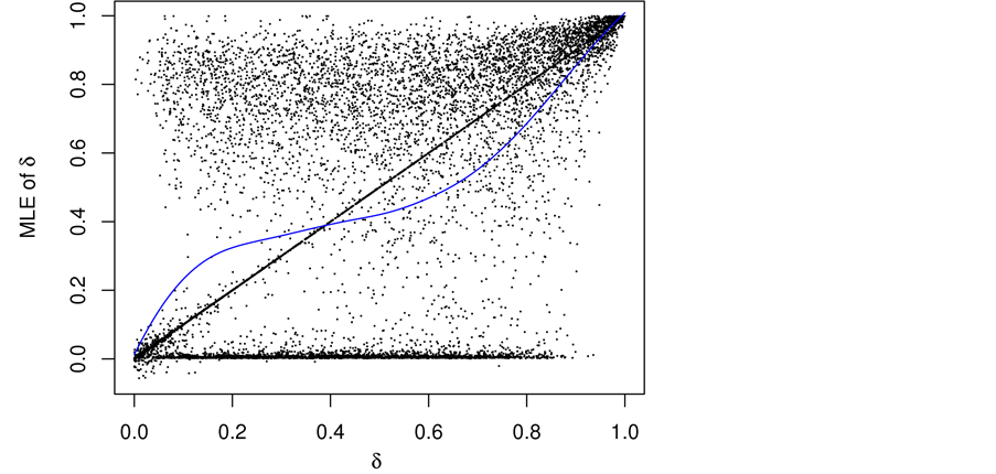 , but a small proportion of points lie very near the 45 degree line, as one would hope most of them would. The solid line is a local linear estimate, indicating considerable bias in the ML estimates for most values of