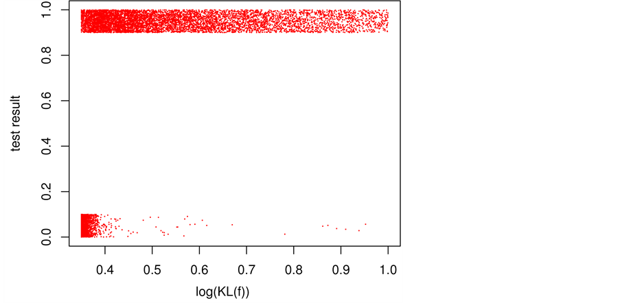 Figure 6. Results for kernel-based test as a function of Kullback-Leibler divergence. The data points have been jittered. Those between 0.9 and 1 on the vertical scale represent rejections of