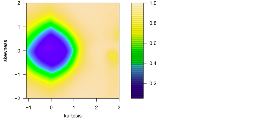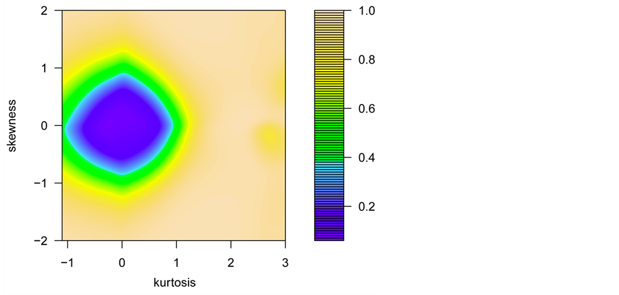 Finally, we present heat plots showing how the power of the two tests are related to skewness and kurtosis. Define the transformation