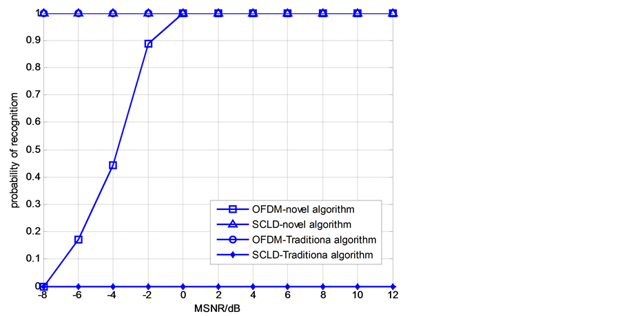 In Figure 5, the probability of correctly recognizing an OFDM signal is plotted versus MSNR. According to Figure 5, the algorithm based on traditional second-order cyclic statistics severely degraded within the range of the entire MSNR, but the proposed algorithm has a significant performance advantage. Note that the probability of correct detection and OFDM signal of the proposed