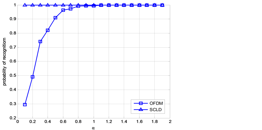value and the more obvious peak characteristics of alpha-stable distribution. The probability of correct recognition of OFDM is 100%, when