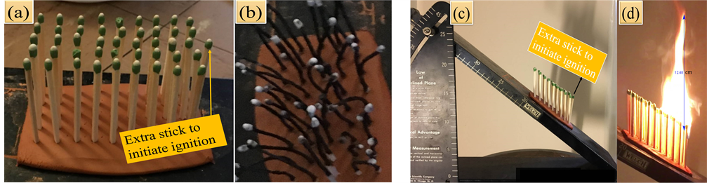 Figure 1. Experimental Setup. (a)-(d) represent experimental setup for matchsticks inserted on a clay bed, curled up burnt sticks, fuel bed at 40˚ slope, and burning sticks, respectively.