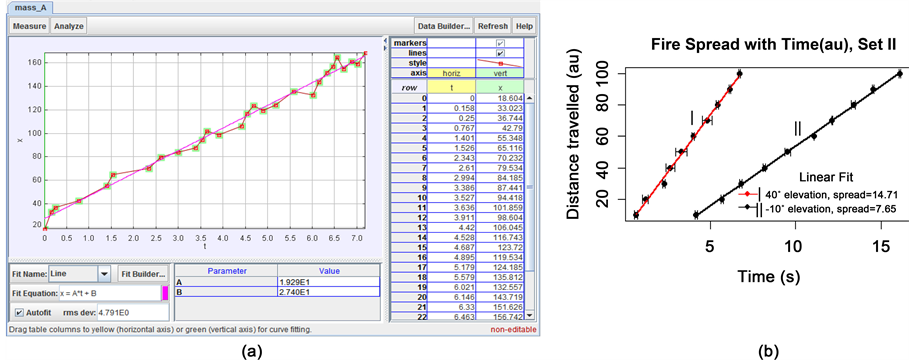 Figure 2(a) shows the data generated by Tracker tool as a distance travelled by the fire progressing with time along the x-axis on a fuel bed, and Figure 2(b) is the best linear fit to determine the rate of fire spread. We used a R software to analyze the data once the data were generated from Tracker. The equation of line of best fit in Figure 2(b) is