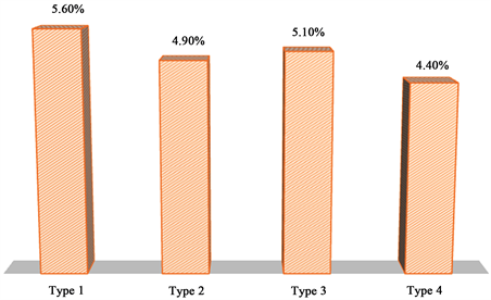 Figure 4 shows most respondents escaped hyperbolic discounting, a result that is in line with the literature [6] [10] . For the minority affected, comparing the hyperbolic discounting of Type 1 with Type 3, and Type 2 with Type 4, one can see there was no “magnitude effect” [17] , a phenomenon that occurs when participants are sensitive not only to the relative differences in money amounts, but also to the absolute differences. A Wilcoxon signed ranks test confirmed the differences between Type 1 and Type 3 were not statistically significant (Z = −0.412 based on positive ranks; asymptotic significance two-tailed p-value = 0.680). The same was true of the differences between Type 2 and Type 4 (Z = −0.457; p-value = 0.647). This result may be due to the fact that the magnitude effect may not affect the wealthy in our sample the same way it affects everyone else.