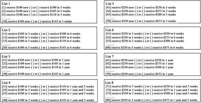 Figure 1. Choice lists for gauging hyperbolic discounting. Adapted from Sutter et al. [12] .