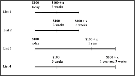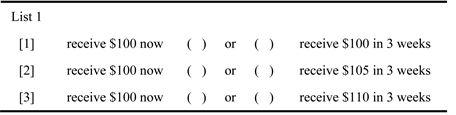 discounting is constant or not, we compare the future equivalents between such lists. If future equivalents are higher for List 1 than for List 2, and for List 3 than for List 4, the early payoff receives more weight than the payoff in three weeks. This would provide evidence of hyperbolic discounting. We can further control for the effects of stake size by considering these four timing combinations for both high and low stakes.
