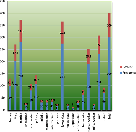Education profile show that 80 (26.7%) illiterate, 107 (35.7%) primary level, 30 (10%) middle level, 30 (10%) matriculation level, 34 (11.3%) intermediate level while only 17 (5.7%) were graduated. A waste number of patients 274 (91.3%) belonged to lower economic class, while 17 (5.7%) to middle class and 09 (3.0%) to upper class.