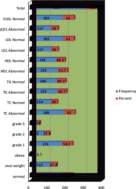 Figure 2. Frequency and percentages of lipid profile, grades of fatty liver and BMI. n = 300.