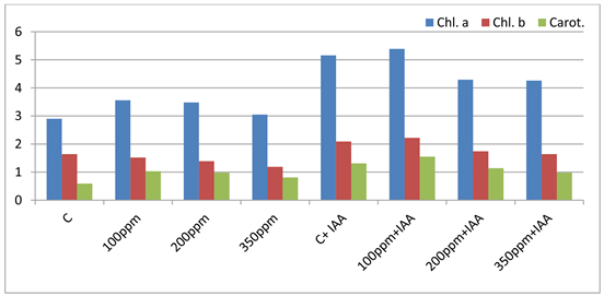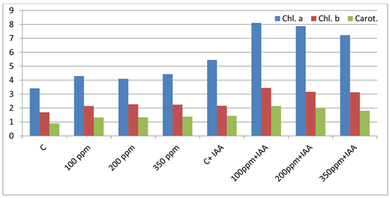 Cu++. Then a slight reduction was exhibited only at the highest dose of Cu++ (about 15%). A marked and progressive increase in leaf area was exhibited as a result of IAA treatment in cv. Assiut 84 (Figure 1). Also, the slight reduction in leaf area at the level of 350 ppm Cu++ was completely eliminated by IAA treatment. Moreover, the leaf area increased by 14.42% as a result of 350 ppm Cu++ and IAA treatments. Hormonal treatments completely alleviated the drastic effect of the higher doses of Cu++ on the leaf area of cv. Assiut 125. Again, the data of leaf area indicated the superiority of cv. Assiut 84 (Figure 1). A marked and progressive additional increase in these values was exhibited as a result of IAA treatments, whatever the level of Cu++ used and the fraction of the photosynthetic pigment analyzed in cv. Assiut 84 (Figure 2(a)). Interestingly, the contents of chlorophyll a, chlorophyll b and carotenoids was about 2-fold those of control as a result of 350 ppm Cu++ plus IAA. A marked and progressive accumulation in the photosynthetically active pigments was obtained when the Cu2+-affected plants were sprayed by IAA in cv. Assiut 125 (Figure 2(b)). This promoting effect was more pronounced in carotenoids and chlorophyll a than in chlorophyll b at most Cu2+ levels. At the level of 350 ppm Cu++ plus IAA the percent of increase in chlorophyll a, chlorophyll b and carotenoids was 46.9%, 0.0% and 66.1%, respectively. In roots and stems of cv. Assiut 84 the