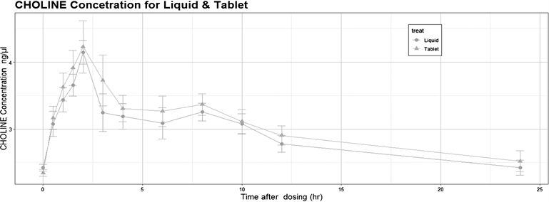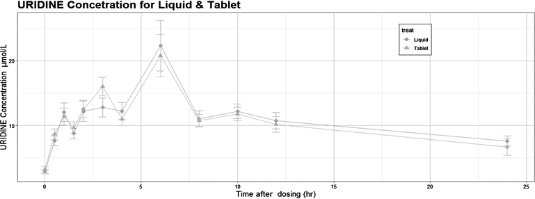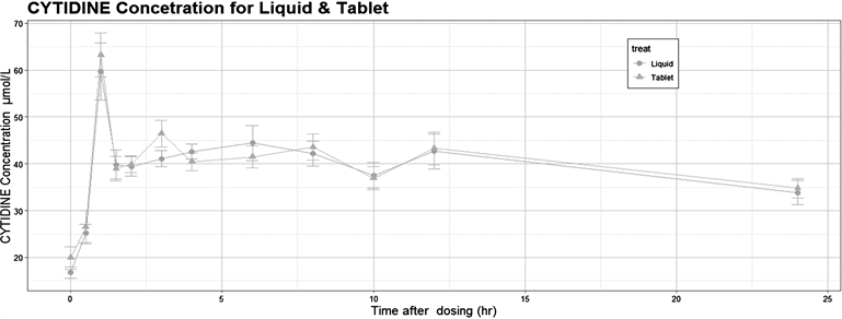 Cytidine and choline plasma exposure for tablet was slightly higher than that for liquid form, while uridine plasma exposure was slightly higher for liquid form; however, no statistical differences were observed for plasma exposure between solid and liquid formulation.