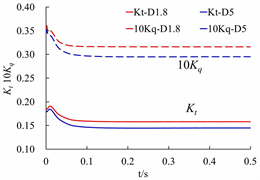 Figure 6 shows the time histories of thrust and torque coefficients of the propeller at J = 0.833 for both cases. As we can see, the two curves, thrust and torque coefficients, have converged and remained stable after 0.2 s. The thrust of the propeller in restricted channel is always larger than that in the open water, and the tendency of torque is the same as the thrust. This is because that in order to maintain flux conservation, the advance speed of the propeller in restricted channel is relatively smaller than the open water case.