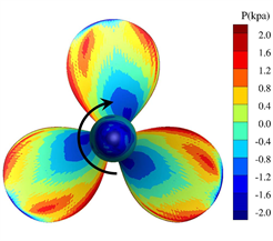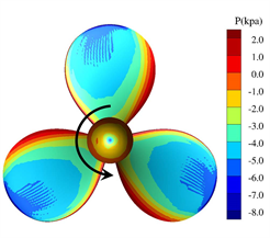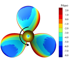 Table 4 presents the comparison between the predicted results and experimental data. In open water, the predicted results are in good agreement with the experimental data, with the error of thrust and torque coefficients are less than