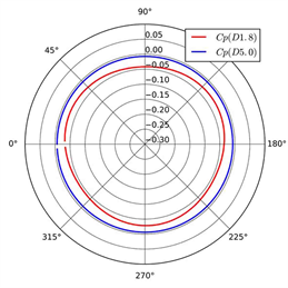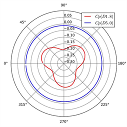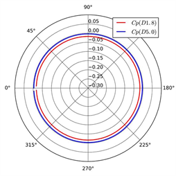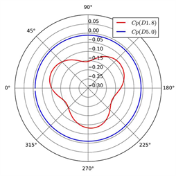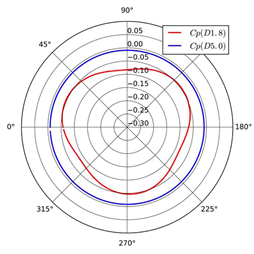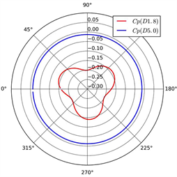The pressure on the wall varies downstream due to the propeller rotation. Figure 8 presents the variation of pressure coefficient on the wall of the tunnel downstream. For the case D5.0, the pressure coefficient remains essentially constant along the circumference, while three peaks occur in restricted channel because the propeller DTMB 4119 owns 3 blades. In front of the propeller disk, x/D = −0.30 and −0.20, the pressure relatively increases when the position is closer to the disk. For the case D1.8, the pressure on the wall downstream gradually