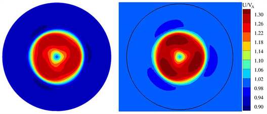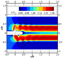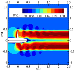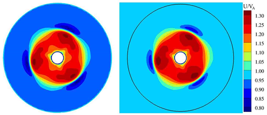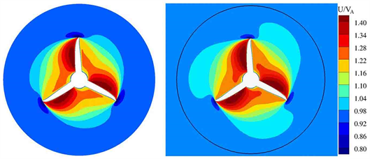The variation of the pressure coefficient on the wall is caused by the difference of the velocity in the flow field. Figure 10 shows the axial velocity in the Cartesian coordinate system. Left are the results in restricted channel with right being obtained in open water. The black curve in the figure indicates the position of 1.8 D.