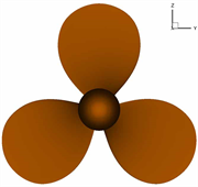 In the present work, DTMB 4119 propeller is used for all the simulations. The main parameters are presented in Table 1. Figure 1 shows the geometry: left is 3D view, middle is front and right is side view, respectively.