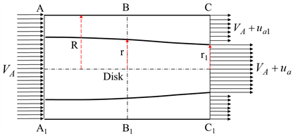 where, VA is the advance speed, R is the radius of restricted channel, r1 represents the radius of slipstream region that is the radius of propeller substantially. ua is the axial induced velocity in the slipstream region while ua1 is the axial induced velocity outside the slipstream region.