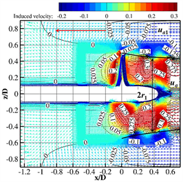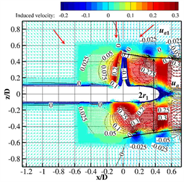 Figure 9. The positive and negative induced velocity meet near x/D = −1.0 upstream, causing the inflow velocity of the propeller to decrease relatively. While in open water, the negative induced velocity is very little since the region outside the slipstream region is larger than that in restricted channel. And under this condition, the axial induced velocity flow into the disk from all the sides.