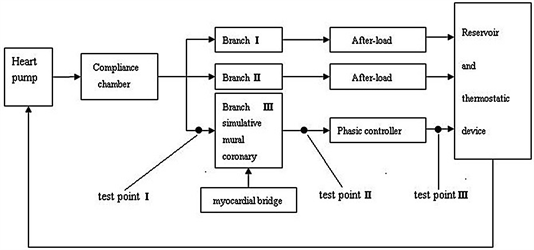 The hemodynamic model [8] as illustrated in Figure 1 is a circulatory system including a heart pump, a compliance chamber, MB, phase coronary blood flow component, after-load, a reservoir, a thermostatic device and measuring devices.