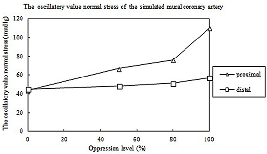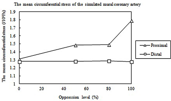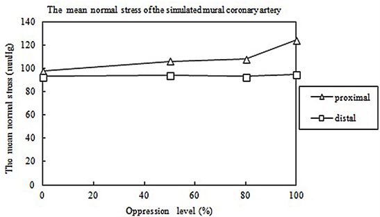 If the MB presses the MC, with the increase in the oppression level, the mean value of normal stress and circumferential stress will both increase at the proximal end and the mean value of the shear stress will increase at the distal end. The normal stress increases because the blood kinetic energy is transformed into the pressure energy when the MB presses the MC. Because the circumferential stress is proportional to the normal stress [10], the circumferential stress also increases at the proximal end. The mean value of the shear stress increases due to the increase in the blood flow at the distal end when the MB presses the MC. The experimental results show that the maximum, minimum ,mean and oscillation value of proximal wall shear stress are 14.359 Pa, 0.058 Pa, 4.17 Pa and 14.301 Pa respectively when the degree of oppression is 100%, while, the maximum, minimum, mean and oscillation value of distal wall shear stress are 11.842 Pa, 0.137 Pa, 5.07 Pa and 11.705 Pa respectively. The mean shear stress value is proportional to the mean flow-rate in a cardiac cycle, so it is reasonable that proximal flow is less than distal flow in a cycle.