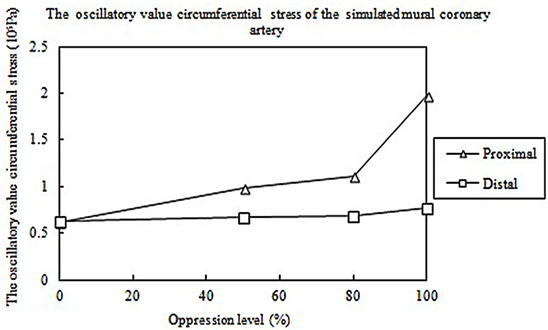 circumferential stress (maximum-minimum) is obviously higher than that of the distal. Moreover, an increasing oppression level leads to an increase in the oscillatory value of proximal circumferential stress (see Figure 5).