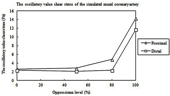 As the oppression level increases, the mean distal shear stress increases (Figure 6). The oscillatory value of the proximal shear stress (maximum-minimum) is obviously higher than that of the distal. Moreover, an increasing oppression level leads to an increase in the oscillatory value of proximal shear stress (Figure 7).