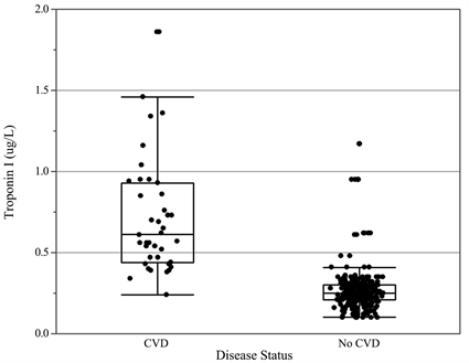 Figure 1. Boxplot of Troponin I (ug/L) by cardio vascular disease (CVD) status.