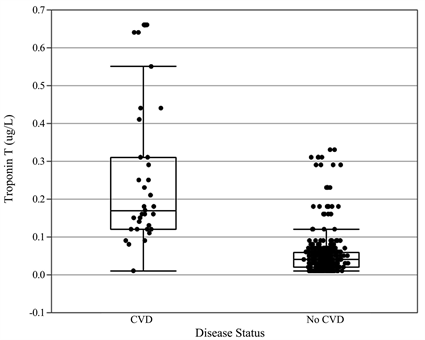 Figure 2. Boxplot of Troponin T (ug/L) by cardio vascular disease (CVD) status.