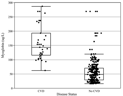 Figure 3. Boxplot of myoglobin (ug/L) by cardio vascular disease (CVD) status.